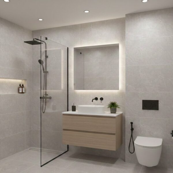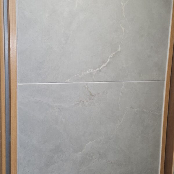 A light pearl grey tile with very subtle white marble veins and the occasional note of rusty orange. Works well on its own, or paired with the Pietra Lagos Grey for contrast.
