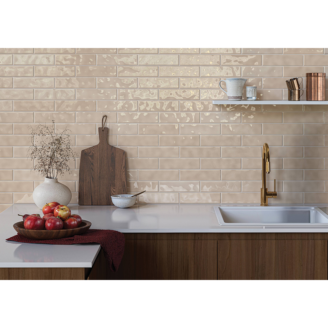 Prisma is a ripple textured, glossy ceramic range. Shade variations throughout the tiles break up the colour for a modern take on the zellige look.