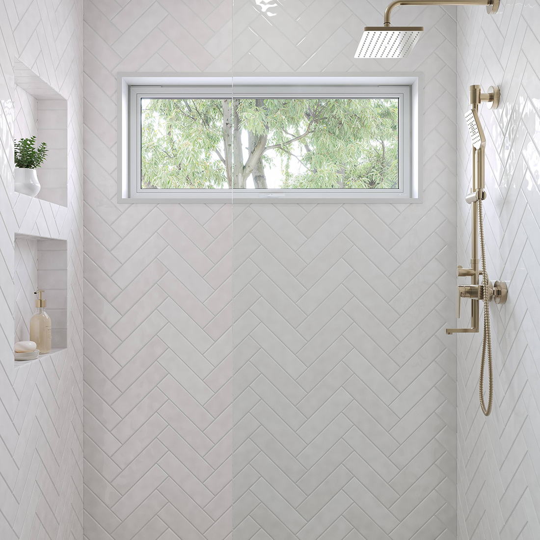 Prisma is a ripple textured, glossy ceramic range. Shade variations throughout the tiles break up the colour for a modern take on the zellige look. The Off White has tones of Light Grey within it.